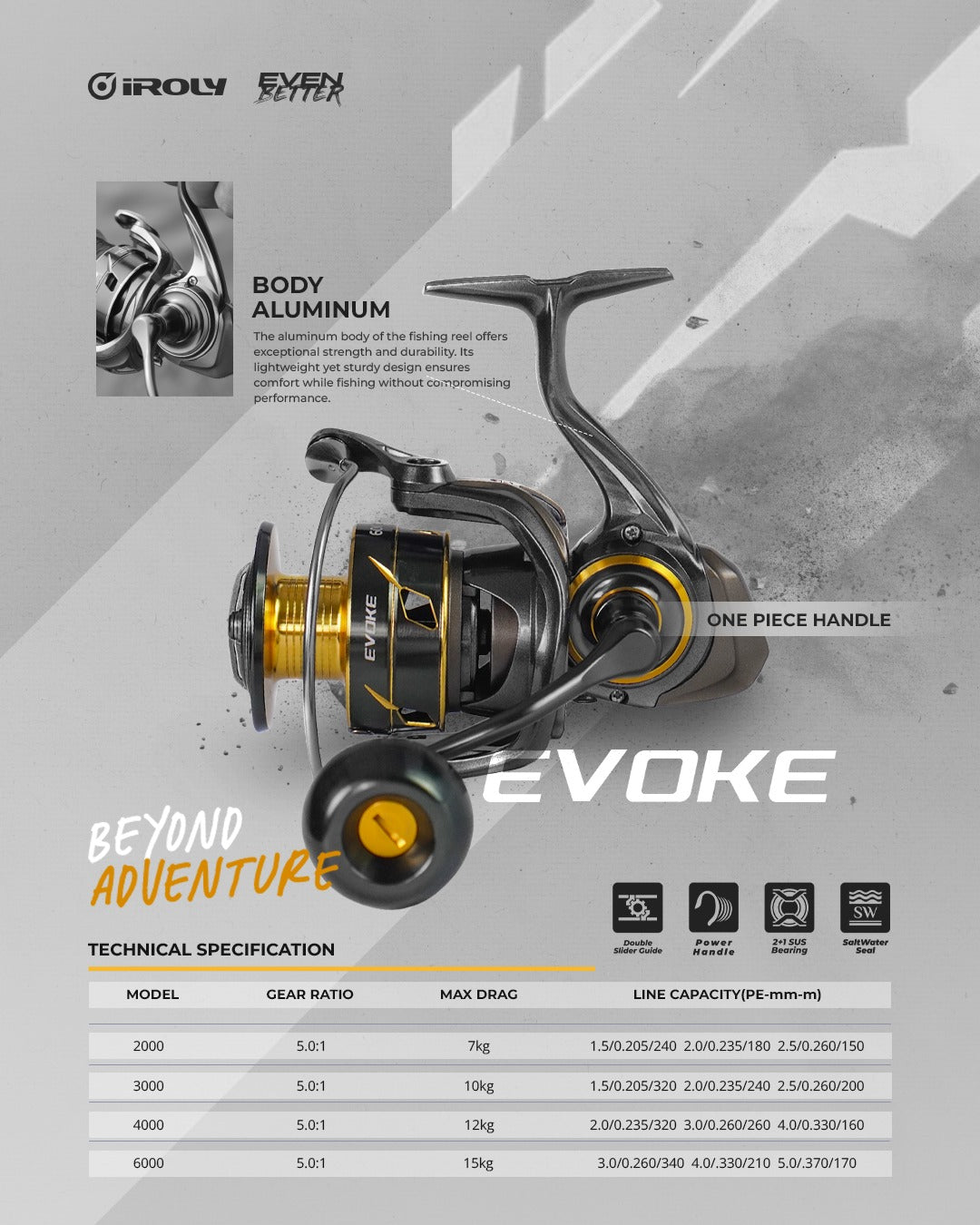 The Iroly Evoke is designed to meet the needs of anglers who demand a strong, long-lasting reel. Built with a sturdy aluminum body that naturally resists corrosion, the Evoke features a double slider guide, sealed ball bearings, and precision engineering to ensure long-term durability. Its one-piece power handle provides enhanced stability and a smooth retrieve, giving you greater control with every cast.