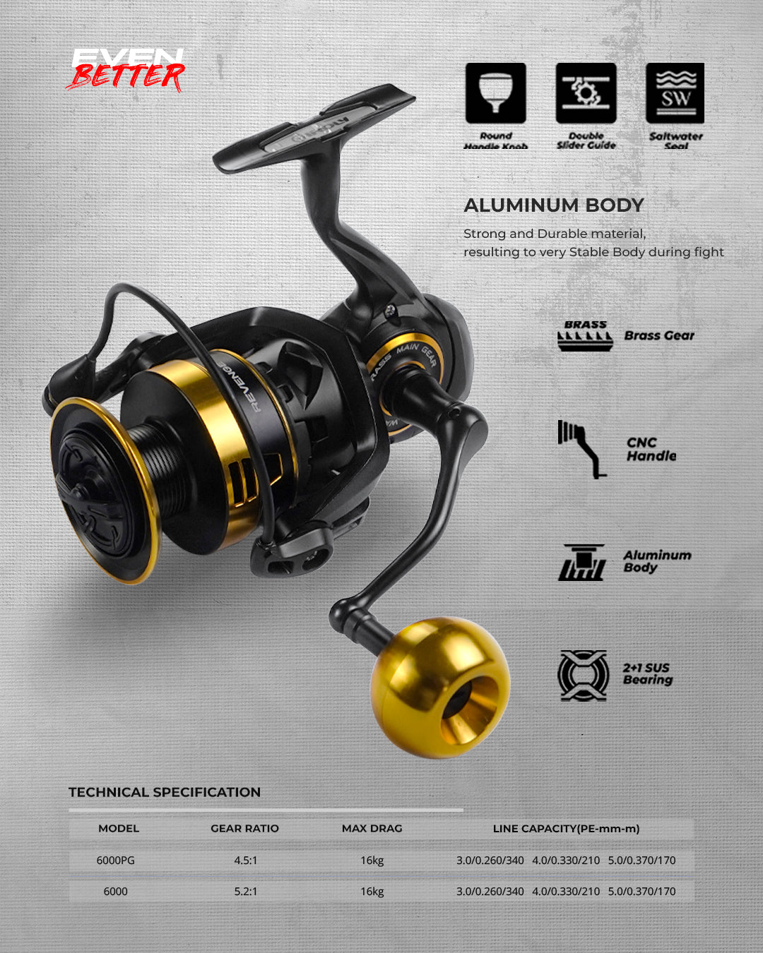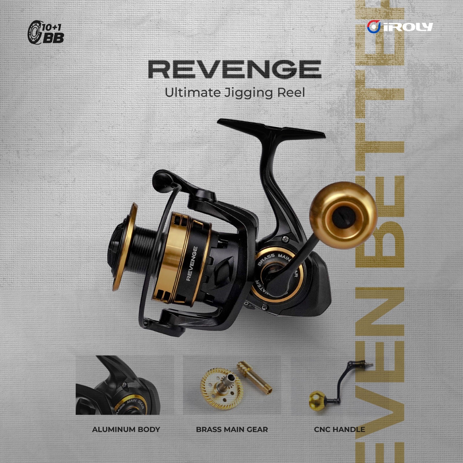 The Iroly Revenge is engineered for serious anglers, delivering power, durability, and precision. Its large brass drive gear and lightweight aluminum body provide smooth, stable performance, while stainless steel bearings and a fully sealed, saltwater-resistant design protect against wear. Available in 6000 (5.2:1) and 6000PG (4.5:1), this reel excels at jigging and tackling tough fish with confidence.